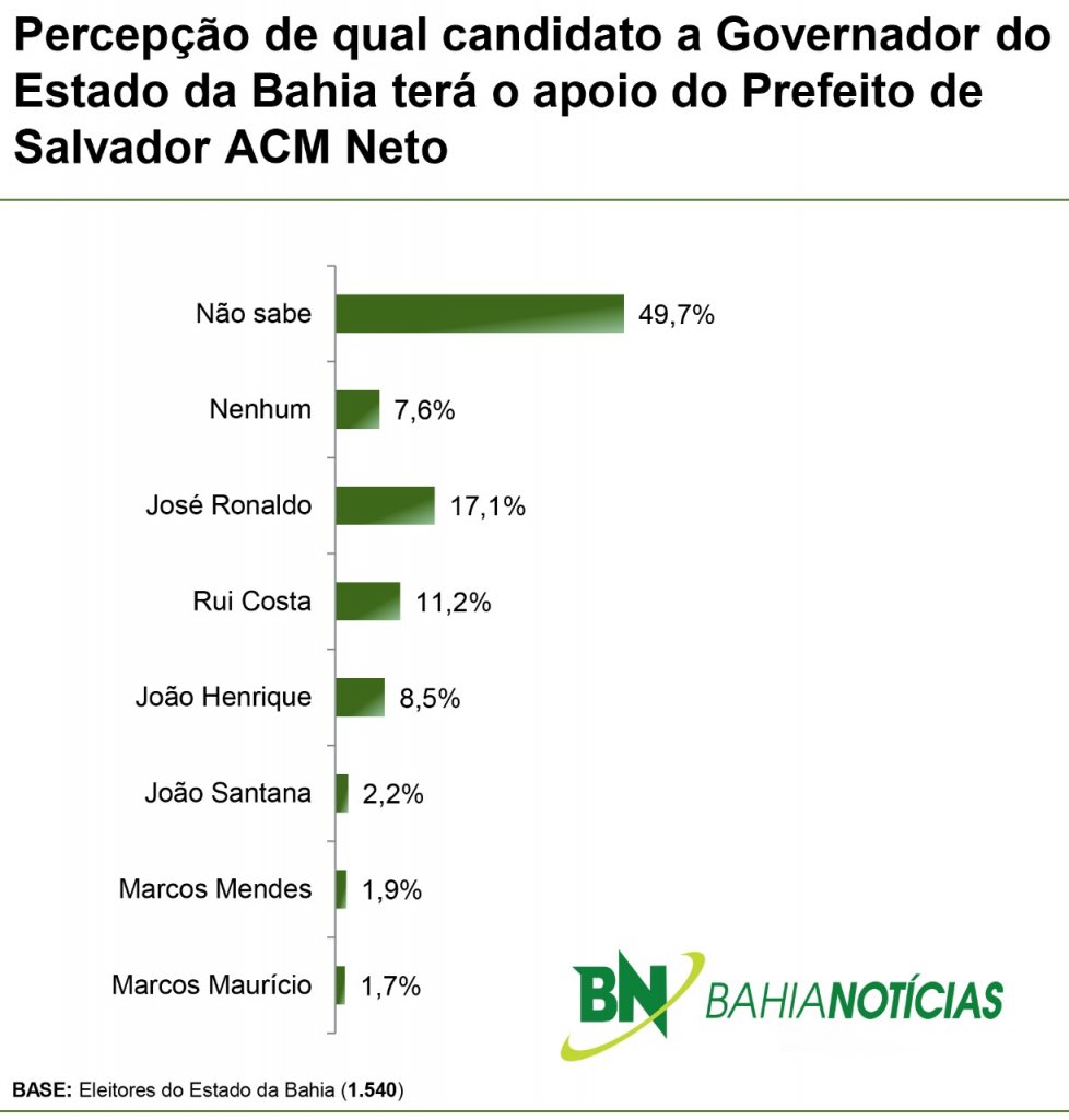 A pesquisa Instituto Paraná Pesquisa, divulgada nesta terça-feira (29), mostra que 11,2% dos entrevistados acreditam que o prefeito de Salvador, ACM Neto (DEM), vai apoiar o governador da Bahia, Rui Costa (PT), em sua campanha à reeleição. O candidato mesmo do gestor soteropolitano, José Ronaldo (DEM), aparece com 17,1%. O ex-prefeito João Henrique (PRTB) tem 8,5% da certeza do eleitorado ouvido pelo instituto de que receberá o apoio do democrata, seguido por João Santana (MDB), com 2,2%; Marcos Mendes (PSOL), 1,9%; e Marcos Maurício (PSDC) 1,7%. O levantamento Paraná Pesquisas ouviu 1.540 eleitores entre os dias 23 e 28 de maio e está registrado no Tribunal Superior Eleitoral (TSE) sob nº BA-08989/2018. Possui margem de erro de 2,5% para mais ou para menos e intervalo de confiança de 95%.